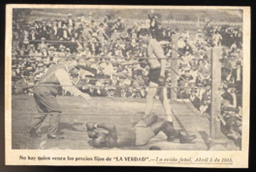 Incredible piece is filled with history. Shows famed image of the count of Johnson down with his gloves shielding his eyes from the blaring sun. The fact that he was aware enough to do this was supposed proof that Johnson threw the fight (to stay out of prison). The postcard specifically relates to this issue. Entitled, "The Truth" (translated), it asks you to send this postcard in to vote on your opinion of whether Johnson threw the fight or not. On verso is the address to send this to and a handwritten note by the owner of the big "prize fight" at "Oriental Park" in Mariano on April 5, 1915. The first Cuban Johnson-Willard piece we have seen.