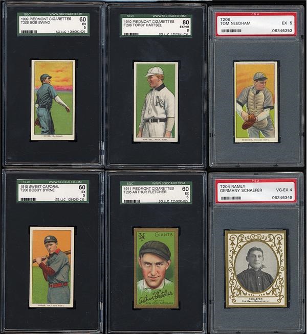 This collection of 14 beautiful vintage baseball cards are in remarkable condition. Graded cards in the set include: EX-NM 6 1910 Piedmont Cigarettes T206 Topsy Hartsel, EX 5 1909 Piedmont Cigarettes T206 Bob Ewing, EX 5 Piedmont Cigarettes T206 Tom Needham, EX 5 1911 Piedmont Cigarettes T205 Arthur Fletcher, EX 5 1910 Sweet Caporal Cigarettes T206 Bobby Byrne, VG-EX 4 Ramly Cigarettes T204 Schaefer.Also included are McIntyre (EX) and McGraw (VG). Ungraded cards include: Overall, Miller, Spade, L. Tannehill, Charles O'Leary, and one John Titus by Honest Long Cut Tobacco. All cards in the collection have held up very well over the years, and present nicely.