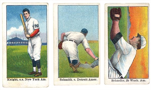 These three vintage baseball cards, from the Croft and Allen Candy Company, feature artful renderings of turn-of-the-century baseball players Schmidt, Knight, and Schaefer engaged in play. All three cards, circa 1909, are in VG condition, with nice color and minimal fading for their age.