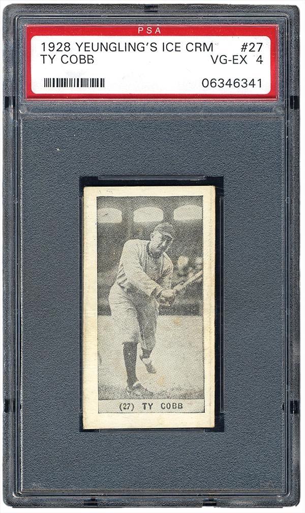 Ty Cobb, one of baseball's early greats, is depicted here in a full-body black and white photograph, with bat in mid-swing. The vintage card, from 1928 by Yuenling's Ice Cream, has been rated VG-EX by PSA. On the reverse, details are listed for redeeming prizes for holding cards -- an ice cream novelty for every Babe Ruth card, and a gallon of Yuengling's Ice Cream to the holder of a complete set of sixty baseball cards.