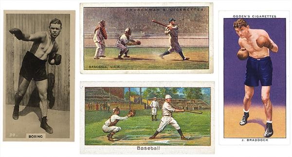 A great collection for any vintage card lover. This lot features dozens of beautiful cards in four complete sets. The first, from Churchman's Cigarettes, sports 25 NR-MT cards with full color art, including one of Babe Ruth. The next, by Turf Cigarettes, features 25 NR-MT and two VG cards with full color art, and includes George Sisler. The third set in the lot is the Champions of Ogden set from 1936, and is made up of 50 NR-MT cards with full color art. The final set is the "World of Sport" set, and features 50 NR-MT cards with sepia photographs on the front. All cards in the set feature information on the reverse about the subject depicted on the front.