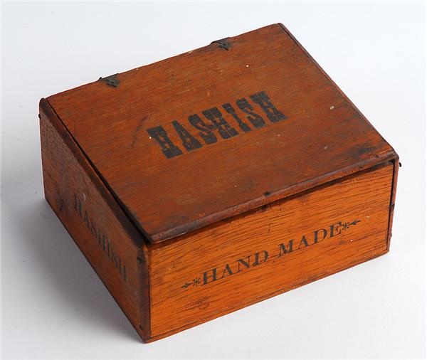 “Handmade” cigars were once inside this box entitled “Hashish.” Beautifully seasoned wood is imported with black and gold lettering. Measures 6 x 5 x 3”. Great stash box.