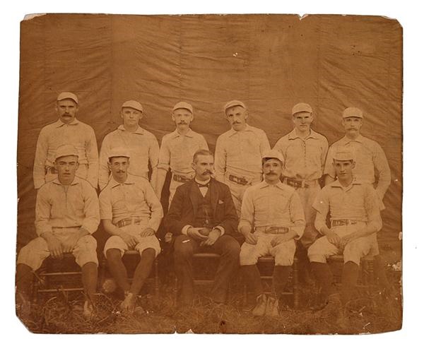 Gorgeous photograph is written in vintage ink on verso, “Cincinnati Shamrocks Champions Amateurs Ohio Kentucky and Indiana 1884 1885 1886 H.F. Baumgartner Manager Taken at Cincinnati’s League Park.” Super team photo with manager Baumgartner holding the trophy baseball. Some chipping to edges o/w EX with nice contrast. 12 x 10”.