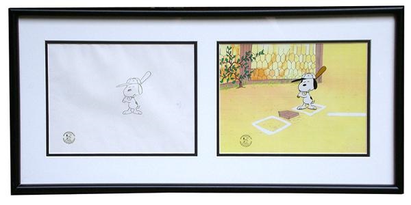 Nicely framed paired of the original drawing and matching cel from the 1983 television special, “The Charlie Brown and Snoopy Show.” Original background is the rarest part of this piece as the ratio of cels to handpainted backgrounds were always exponential. Great image of Snoopy at the bat. From the “Peanuts Gallery” the official seller of their stuff, you cannot get more authentic than this. Authentication labels on both as well as their COA. Framed and matted to 29 x 14” overall. NRMT.