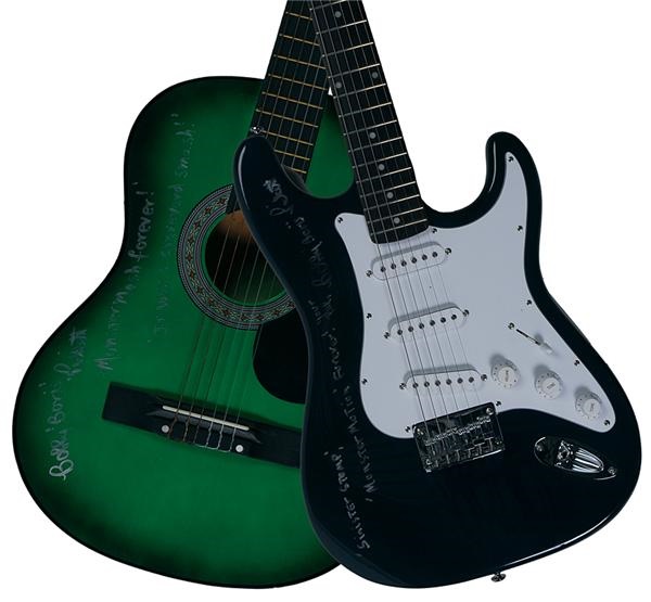 Group of items includes a kryptonite green acoustic guitar that's signed, "Bobby 'Boris' Pickett, 'Monster Mash Forever!', 'It was' a graveyard smash!" Navy blue and white electric guitar that comes in black zip bag is signed with, " 'Sinister Stomp,' 'Monster Motion,' Forever! Your pal, Bobby 'Boris' Pickett." Also included: a signed drumhead, 45's with signed picture sleeve, signed sheet music, videos, cd's, and an 8 track tape. A toy that plays "Monster Mash" is included, a small jukebox sticker, a signed 8 x 10 photo, and others in this goulish set.