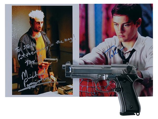 First we have a semi-automatic pistol (movie prop) that was used by actor Michael Papajohn as the villain who killed Uncle Ben in the movie that caused Peter Parker to become a superhero. Very important prop because the Spiderman costumes were cut up. Also included is a Toby McGuire signed photo, an 8 x 10" color signed photo of Papajohn holding the gun, and a Japanese movie poster signed by creator Stan Lee from his personal collection.