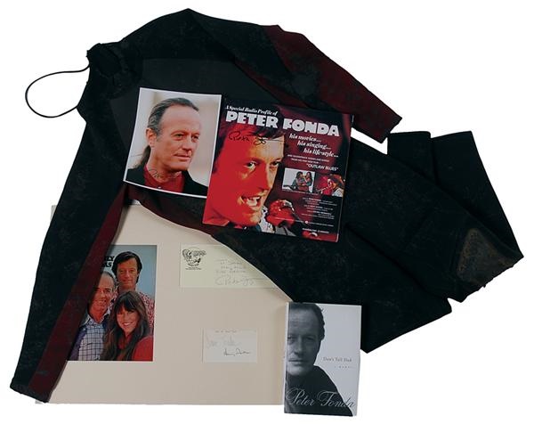 The Fonda name is one of the most infamous of American celebrities. The Fondas were a family of talented performers that were just as well-known for their off-set antics and dramatic personal lives as they were for their film careers. This lot, featuring odds and ends from the life of Peter Fonda, is an interesting look into the unseen parts of a tabloid-chronicled life. The package includes: An autographed copy of Peter's autobiography, "Don't Tell Dad," three separate drawings by a young Peter Fonda for father Henry, personalized car and motorcycle license plates (both "PFONDA"), and the original wetsuit worn by Fonda in "Escape from L.A." Also included: an envelope from Peter inscribed "To Steve, Many Thanks! Ride forever. Peter Fonda," which has been matted to 18 x 24" and includes a card signed by both Jane and Henry Fonda, an 8 x 10” photo of all three, a signed 8 x 10” photo of Peter, an 8 x 10” photo of Pete and Buzz Aldrin on a Ski Doo, signed by Buzz and inscribed "Peter, enjoyed our 'encounter with fun.' See ya soon partner, Buzz Aldrin.", and a signed promotional LP with an interview of Fonda.