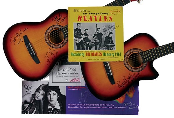 From their days on the Ed Sullivan Show, through their experimental late-1960's period, and all the way to today with their recently released Rock Band videogame, the Beatles have proven themselves as one of the most enduring and iconic names in rock and roll. This lot features a collection of Beatles-related memorabilia, including: two 2 acoustic guitars signed by Pete Best; two acoustic guitars signed by three members of Wings (Denny Laine, Denny Seiwell, and Laurence Juber), with a "Wings" inscription on each, a Wings "Wingspan" poster signed by the above three, a copy of "This is the .... The Savage Young Beatles" LP, signed by Pete Best, and a flyer for David Peel & the Lower East Side Band's "The Pope Smokes Dope" LP, signed in red marker by Peel. Beneath the band's name, "Produced by John Lennon / Yoko Ono" appears in black type. The entire Beatles set covers some of the closest people to the band, and is a great collection for any serious Beatlemaniac.