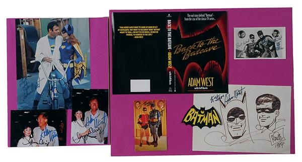 Attention Family Guy fans: before his was the mayor of Quahog, Rhode Island, Adam West played Batman on TV. This lot includes two plexiglass frames filled with Batman memorabilia. The first has an 8 x 10" drawing of Batman and Robin by creator Bob Kane, two 1960's promotional Batman postcards, and a prototype cover for West's autobiography Back to the Batcave, all signed by Adam West. The second contains an 8 x 10" color promo photo of West and Yvonne Craig in their bat costumes, and two more recent snapshots of West and Craig; all three photos are signed by both West and Craig.