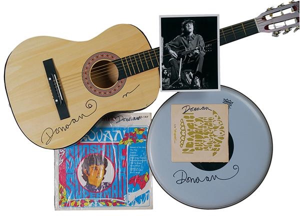 Maybe you can't catch the wind, but you can catch these three small acoustic guitars all signed on the body by Donovan. One was decorated by Donovan with a seascape drawing; another sports a "V-shaped" bird (all in black Sharpie). Also included are a 15.5" drum head, a 7 x 9" glossy photo, Donovan's "Sunrise Superman" record album, and a 45 rpm picture sleeve "Wear Your Love Like Heaven" b/w "Oh Gosh,” all signed by Donovan himself.