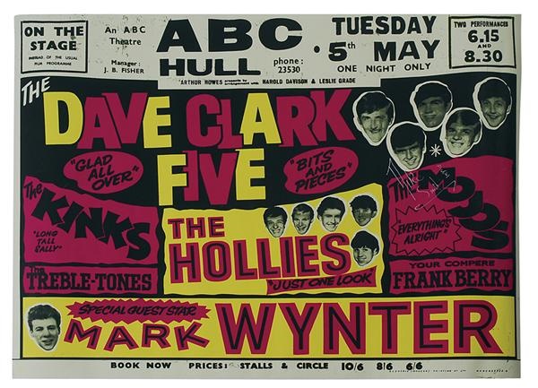 While they never achieved the ultimate longevity or mass appeal of their forerunners, the Beatles, the Dave Clark Five were the second band of the British Invasion to score a chart hit in the United States and help usher in a trend that changed the face of popular music in the 1960's. This lot is a collection of items that commemorates the career of this recent Rock and Roll Hall of Fame inductee. Items include: Mike Smith's own gold records for both "Glad All Over" and "Greatest Hits", a DC5 gold 45 record, and a large poster of the group signed by Mike Smith, inscribed "DCV."