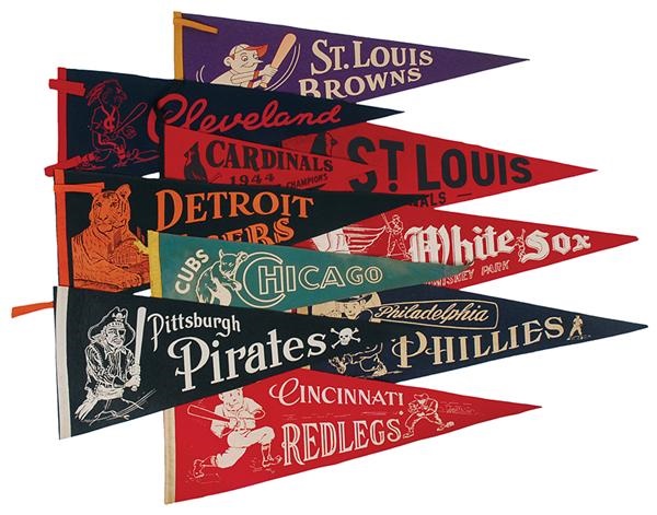 Beautiful full size grouping includes Chicago White Sox (scarce Comiskey Park variation), Philadelphia Phillies, St. Louis Browns, Chicago Cubs, Cincinnati Redlegs, St. Louis Cardinals, Pittsburgh Pirates, scarce Cleveland Indians in black, Detroit Tigers and smaller 1944 St. Louis Cardinals National League Champions. Overall EX-MT.
