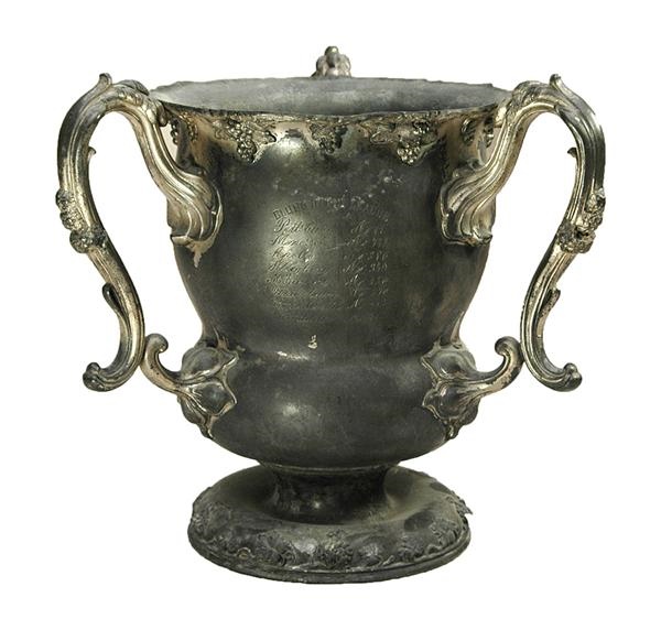 Elaborate “Elks” loving cup in quadruple silver plate. Three sided. One side features, “Pittsburgh Lodge -- Champions of B.P.O.E. Baseball League Southeastern Pennsylvania Season of 1907.” Second side lists all of the players on the winning team and the third side displays the teams in the league. Silver shows wear o/w EX. 11” tall.