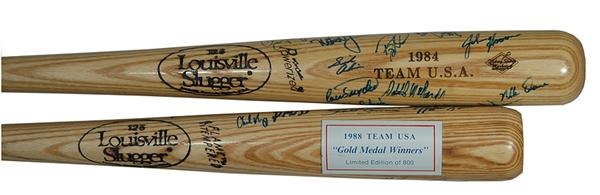 1) 1984 with 20 signatures including Mark McGwire, Will Clark, BJ Surhoff, and Corey Snyder. NRMT. 2) 1988 bat limited to 800 pieces. 19 signatures and a little bit of smearing. Beautiful blue Sharpie signatures of these phenoms.