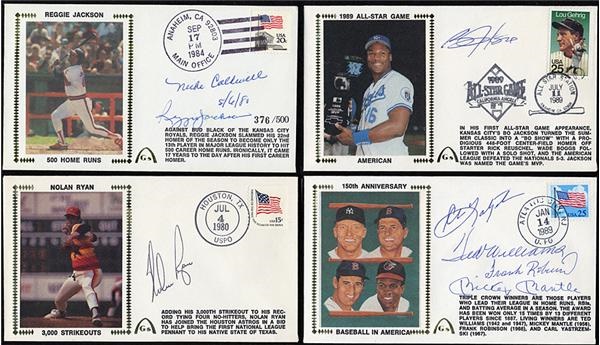 Actual postal covers from the city and date of the events picture the players and are signed by them. Includes: Yount 3000, Wood 20k, Santiago, Schmidt 500, Snider HOF, Seaver 300, Sutton 300, Ripken 2131, Ryan 5000, Righetti, Ripken innings, Mattingly Grand Slams, McCovey 500, Ryan 3000, McGwire 39th, Lasorda HOF, Joyner rookie, Reggie HOF, Reggie Mr. October, Reggie/Caldwell 500, Bo All Star, Hershiser/Drysdale, Gwynn 3000 (2 difft.), Davis HR, Canseco 40/40, Clark 1989 All Star, Carlton 4000, Carlton 2833, Keltner/Boudreau, 150th Anniversary (signed by Mickey Mantle, Ted Williams, Yaz and Frank Robinson). Mint.