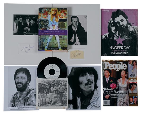 This lot contains assorted memorabilia associated with The Beatles and Brian Epstein, who was often referred to as the Fifth Beatle. First is a 5 x 7" photo of Epstein matted to 11 x 14" which includes Epstein's signature cut below the photo. Next is a 7 x 5" photo of Ed Sullivan with Epstein, John, Ringo and Paul matted to 11 x 14" with Sullivan's signature cut below the photo. Murray the K signed the picture sleeve of a recorded interview he did with the Beatles; both sleeve and record are included. Paul's ex-wife Heather Mills has signed both her autobiography entitled A Single Step, and the People magazine cover featuring her wedding to Paul McCartney; both are included. Other items are: Pattie Boyd's (Mrs. George Harrison and Mrs. Eric Clapton) signed autobiography; signed 8 x 10" glossy of Ringo Starr from his movie "Caveman"; signed 8 x 10" glossy of George Harrison; and a copy of the sheet music to McCartney's song "Another Day" with changes made in red by McCartney himself for a television appearance (sheet is not signed but comes with LOA stating that McCartney indeed made the changes).