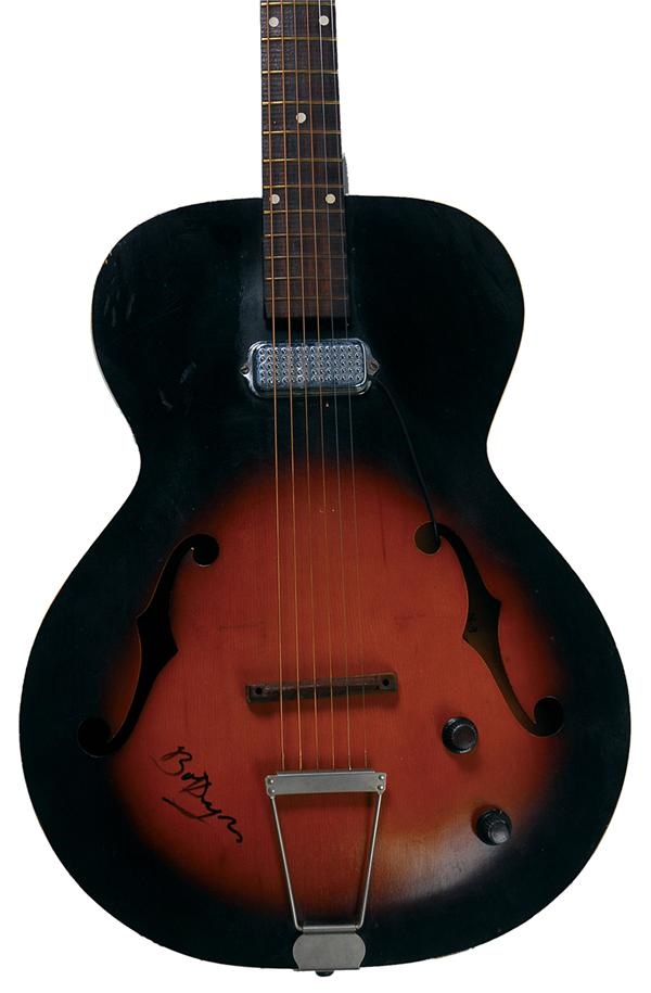Early Dylan acoustic fans and "electric" Dylan fans unite. This is an Archtop acoustic/electric guitar with f-hole soundholes on either side. The guitar is signed in black Sharpie with "Bob Dylan." The inside of the guitar is stamped with "L 5622" and "N-3." Comes in nice, heavily padded black zipper case that says "EURO" on the front.