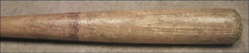 One of the earliest bats we've ever seen from this tragic hero of the diamond. Absolutely devastating use from the Pirate superstar's first season coats the barrel and has left all but invisible hairline cracks in the handle. Knob is chipped, but "S2" is still clearly visible in the stamping. Signature model Hillerich & Bradsby has the uncommon "Momen Clemente" facsimile autograph on the barrel. In short, there's nothing about this bat that isn't exactly what you'd want. If you only buy one Clemente bat in your life, look no further than this one.
