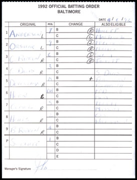 Lot # 936: 1992 First Game at Camden Yards Line-up Card