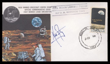 Fascinating piece of space memorabilia. First day cover signed in advance by Armstrong so his wife could sell them to help support their family if he did not make it back. If you notice that the Apollo 11 moon scene looks nothing like what really occurred, as it was pre-printed. Superb cachet with mint blue ink signature. Cancelled Houston 7-20-69 at 3:17 pm, the exact time of the landing. Mint.