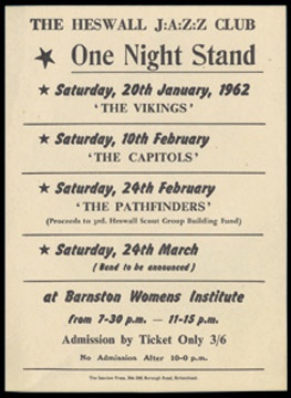 Another historical date in Beatle's lore! It was on this date that the Beatles shared the bill with texas singer, Bruce Channel who was coming of his top ten hit, "Hey! Baby". Worthy of note is the fact that John Lennon was mesmerized by the harmonica playing of Channel bandmember, Delbert McClinton. A fifteen minute impromptu lesson transpired when Lennon asked McClinton to show him how to play the intro to "Hey! Baby". The results of this meeting, of course, can be heard on the group's first Parlophone single, "Love Me Do". Although the song had been rehearsed at their first Parlophone session on June 6, McClinton's influence was unmistakable when the song was recorded on September 11. While it is commonly believed that Channel and the Beatles toured together, their only meeting was at this single Brian Epstein/Bob Wooler promoted event. John had tried his hand at harmonica sporadically since childhood, but not until his meeting with McClinton did John envision it's use in his songwriting and recording. This particular handbill, from the collection of Pete Best, comes with a copy of the Sotheby's London catalog page from which it was originally purchased. Ex. 5" x 7 1/2".