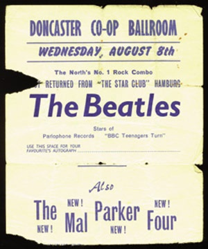 Note that the Beatles are "Stars of Parlophone Records" although "Love Me Do" was not to be released for another month.  Shane Fenton, aka Alvin Stardust shared the bill this night.  The Beatles had to cancel a Cavern gig to accept this prestigious gig 90 miles from Liverpool.  This well-worn handbill was originally the property of Pete Best.  A copy of the Sotheby's London catalog page depicting the handbill is included. 5" x 6".