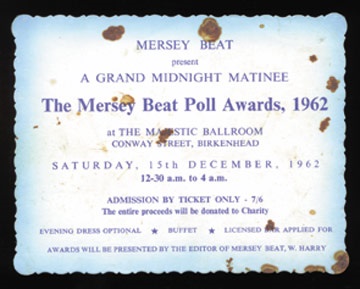 A historic event as the first-ever "Mersey Beat Poll Awards" and charity dinner was held with the Beatles receiving a trophy from editor, Bill Harry, prior to their taking the stage at 4am to close the event with a live performance. The recently ousted Pete Best, now a member of the runner-up band, Lee Curtis and the All-Stars, crossed the Beatle's paths as his band descended the stage giving way to the Beatles. The well-worn ticket, originally the property of Pete Best, comes with a copy of the Sotheby's London catalog page depicting the ticket. Scalloped edges. 4 1/2" x 3 1/2".