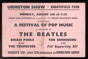 The group topped the bill at this summer festival event held in a huge tent in South Manchester. A very large ticket with middle crease and staining. 5" x 3 1/4".