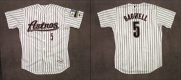 Gorgeous home pinstripe of the best hitter in Astros history. Retro "Astros" across the front with deep red "5". Nice "Bagwell…5" on the back. Gorgeous patch on the sleeve, for the "2000 Inaugural Season" in the new stadium. "Authentic Collection" tag in the tail with the size 48 flag tag. Light wear but all the correct tagging.