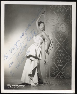 Likely signed in 1951 during her tour of Cuba. Lengthy inscription in mint ink. Fabulous professional photograph by famed Cuban photographer. 8x10". EX-MT.