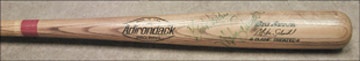 Forty home runs this year led the league, as did his numbers for walks and on-base percentage, so you know he wasn't just swinging this Adirondack Big Stick MS20 like a madman. Barrel shows a few good whacks though, and the "Best Wishes, Mike Schmidt" in blue sharpie is NRMT. Number "20" in marker on knob.
