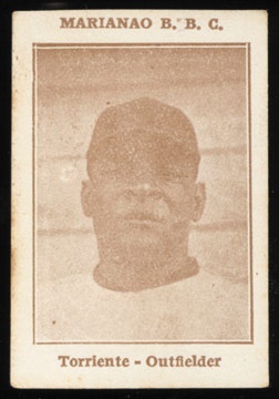 The card measures 2.5x1.75" and is printed in gorgeous sepia. Blank backed, at the top it reads "Marianao B.B.C." The cards from the premium album issued from this set do not have the team names at top. Also, in the premium album he appears with Havana. We only mention this to show that it was not cut from the premium album. This card may be a kind of proof created to bank on the popularity of Torriente and his move to another team. Whether or not the card was ever released is unknown.