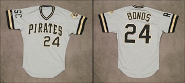 With home run number 500 delivered this year, any doubt as to the power slugger's Hall of Fame future has been eliminated. Of course, we've been watching Bonds memorabilia for years, knowing this guy was hot. One thing we've noticed is that Pirates jerseys are all but non-existent. Where are they? Well, here's one of them, worn on the road runig the superstar outfielder's third year in the Majors. "Pirates 24" spans chest, with "Bonds 24" on verso. Team logo patch adorns the left sleeve, with memorial "RSC" in black lettering on right. Tail tagging is "Rawlings [size] 42," with tapered "T" and "Set 1 1988" flag tag. Use is very strong, with that desirable fading of the black lettering from days in the hot summer sun. You'll be glad you won this one when he gets to Cooperstown.