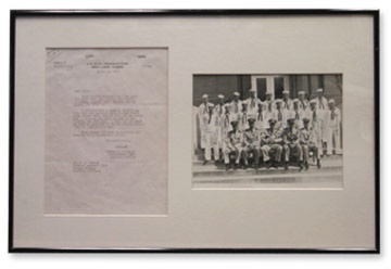 The man who inspired Mr. Mantle to name his son Mickey. At left is a typed letter on "U.S. Naval Training Station, Great Lakes, Illinois" letterhead, with content regarding an exhibition baseball game involving Cochrane's Navy team. It is signed "Mike" at the close. Photo of Cochrane's squad at right is signed in NRMT ink by each pictured, including Cochrane himself, Schoolboy Rowe and Gene Woodling. Matted and framed professionally.