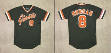 A great eye and a powerful swing made Morgan a hot commodity over his twenty-two seasons in the Majors. This great black mesh jersey was worn by him during the waning years of his career as he took swings for the S.F. squad. "Giants 8" on the chest; "Morgan 8" on back, with his EX-MT black sharpie signature. Use is strong. "Alpha" tagging in collar.