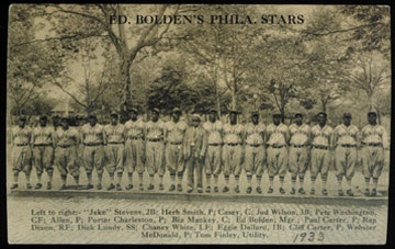 Magnificent slice of ephemera pictures "Ed. Bolden's Phila. Stars." They are lined in impressive "Phila. Stars" uniforms on tree lined boulevard. Texture of the paper is sumptuous, with a sepia look that is rich, clean and quite superior to the norm. Some of the greatest Negro Leaguers ever adorn this team and card: Porter Charleston, P; Biz Mackay, C; Jake Stevens, 2B; Herb Smith, P; Jud Wilson, 3B; Pete Washington, CF; Allen, P; Ed Bolden, Mgr.; Paul Carter, P; Rap Dixon, RF; Dick Lundy, SS; Chaney White, LF; Eggie Dallard, 1B; Cliff Carter, P; Tom Finley, Utility; and Webster McDonald, P. "1933" written in ink by Webster on the front and some minor glue residue and paper loss on the verso, o/w EX-MT.