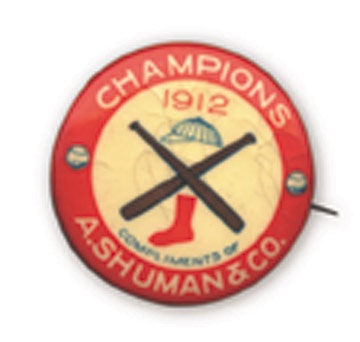 If not for Giants center fielder Fred Snodgrass' muff of a routine fly ball in the tenth inning of the final game of the World Series, this pin would never have been made. But two runs scored as a result of his mistake, giving the BoSox a three to two victory and the Championship of the World. Promotional give-away from "A.Schuman & Co." has light crazing, otherwise EX-MT. Paper back still present.