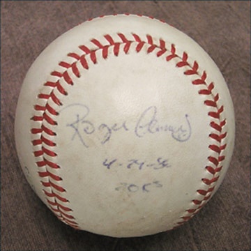 The strong breeze blowing across the ballpark on April 24, 1986 came from the whiffing of twenty bats as they swung hopelessly at the future HOF fireballs. OAL (Brown) ball was used during one of the Rocket's greatest performances ever. Signed, dated and notated, "20 K's" in Clemens hand. LOA.