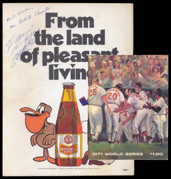 The World Champion HOF Pirate and his wife have each signed the back cover of this official program from the Fall Classic. Roberto's signature is personalized. Both are NRMT, as is the program itself.