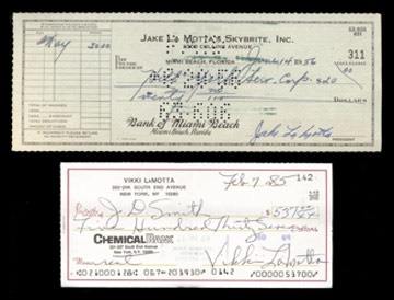 What an incredible marketing opportunity. There are 173 bank checks signed by the Raging Bull himself Jake LaMotta. From 1956-57, they are attractively imprinted "Jake LaMotta, Inc." and "Jake LaMotta's Skybrite" from Miami. These are the companies that landed him in prison for selling booze to minors. 10-20% have marks that barely touch the signatures o/w these large format checks are gorgeous. Best of all they are accompanied by 253 checks of his ex-wife Vikki LaMotta. What a great display they would make together. Prefect for a national marketing campaign because of the awareness created by their relationship in the Scorcese classic Raging Bull.