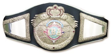 Exceptional quality belt presented to Diego "Chico" Corrales. Beautiful medal face in spirited enamel shows the "IBA" logo in gold. In bright baby blue reads "Continental." Above are ruby-like gems studded in the regal wings that are the eye catcher of this stunning piece. Two plaques on either side are perfect for engraving. This is all mounted on gorgeous black kid with lamb's wool on the inside for comfort when worn into the ring with pride. Matching enamel logo on back is like the "buckle." NRMT. 23" across. In its original black case.. This is NOT a sample. Comes with picture of Diego holding this very belt.