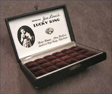 The rings are gone, but the charm and intrigue are not. Great youthful image of the Heavyweight Champ at left is paired with text declaring, "Official Joe Louis Lucky Ring." Ring is pictured just below, with prices at bottom. Hinged black faux leather case is in great shape, with only the slightest corner wear.