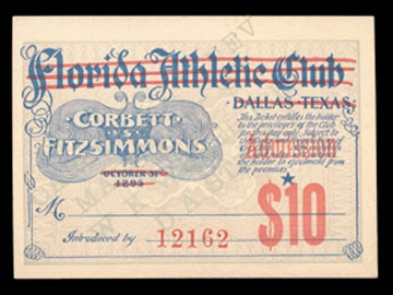 Rare ticket is full and unused from the "Florida Athletic Club…Dallas - Texas." Dated "October 31, 1895," this pits the great gentleman James J. Corbett versus the devastating blacksmith Robert Fitzsimmons. Measures 4x2.75" and is in nice cardboard with legal tender-like verso. NRMT. The fight never took place but was eventually fought in Nevada in 1897, when Corbett lost the title.