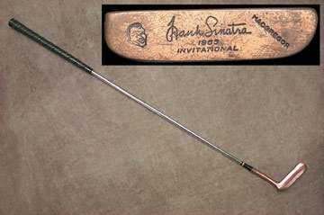 In November 1963, golf heavies and showbiz elite joined together at the Canyon Club in Palm Springs to pay tribute to Frank Sinatra in a five-day swingfest in the desert. It was the one-time-only, PGA-sanctioned, Frank Sinatra Invitational, followed by a black-tie gala in the ballroom of the Palm Springs Riviera Hotel. Presented as souvenirs and given to the 150 VIP guests in attendance was a custom-crafted, Toney Penna-designed, MacGregor IMG-5, heel-shafted putter. Each of these copper-plated gems had the Sinatra signature and caricature likeness forged into the head. None were ever sold, only given out as gifts to the celebrity and amateur swells in attendance. Today they are regarded among the most treasured items in collectible golf. According to putter expert and noted collector Bobby Grace, less than two-dozen examples have surfaced over the years. Grace reports having sold one in Japan for $21,000. This example does show use and would bring a grade of very good to excellent. The putter has been authenticated by Mr. Grace and and will come with his Letter of Authenticity.