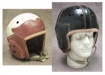 We love these things. It just seems inconceivable that leather headgear like this once was the standard. And these we've acquired are among the strongest specimens we've seen. White and brown helmet is from "Wilson;" black one is by "Goldsmith," with former owner "Ehlert [number] 56" stenciled in white on back. Both are in amazing wearable condition. Even the chinstraps are complete and undamaged.
