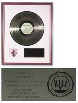 This original "white matte" award for "Mad Dogs & Englishmen," the double live album that contained Cocker's powerful Beatles cover, "A Little Help From My Friends," is presented to A&M Records. The album peaked at number two on the Billboard chart and was certified gold on 8/31/70. It contains a "Disc Award, Ltd." disc, typical of A&M awards throughout the 1970's. While the frame has numerous scratches and dings, this is typical of the soft wood molding used to manufacture awards from the "white matte" era. The original hanging hardware and "New York Frame And Picture Co." sticker are missing from the reverse.