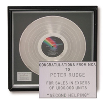 A nice platinum record award for their 1974 "Second Helping" album. Presented to their manager, Peter Rudge, for sales over one million .