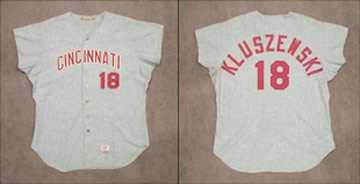 Road grey flannel dates from Klu's tenure coaching the team where he made his name. "Cincinnati 18" is announced from the chest, with "Kluszewski 18" on verso (note that name is restored-all else is 100% original). Name is chain stitched in collar, while tail is tagged, "Wilson" and "1970." Wear is evident, but has done nothing to detract from jersey's top display value.