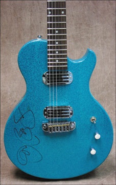 Wow, this beautiful metallic turquoise Brownsville "oh it is so bright" guitar was autographed stunningly by Jon Bon Jovi. Jon, who is always hot, will dress up any wall with this guitar on display.