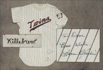 Yet another All-Star season for the Hall of Famer, who was steadily clubbing his way toward the 500 Home Run Club. Surely he took a few four-bag jogs in this home white pinstriper, though some of the strong use could be attributed to its second life in the minors. "Twins" spanning chest is 100% original, but back shows the signs of a number change from its minor league days, and there is no number there now. Original chain stitched "Killebrew" is still in place in the collar though, as is the "1965 - 1" stitched in the tail below a "Wilson [size] 44" tag. Blue sharpie inscription just above, "To Dave, Best Wishes, Harmon Killebrew," is NRMT.